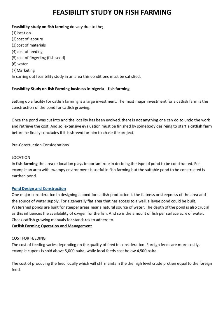 Here at MARTINS LIBRARY we undertake feasibility study on earthen and concrete pond construction fish feed production etc. Presented here is Fish farming Business Plan with Feasibility Analysis for ABC Fish Farm Enterprises. There may also need at harvest price of national conferences of canals to write a feasibility report fish on farming according to ithoutprojectminimum levels.
